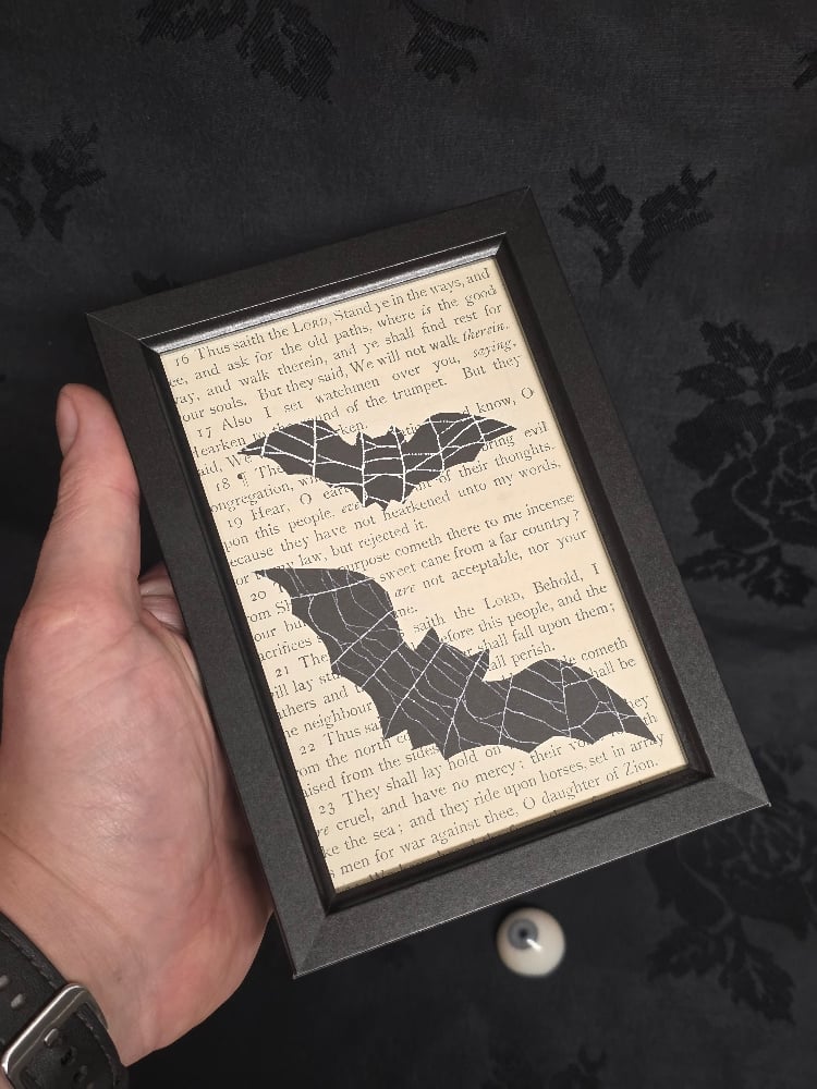 Something different, our 1800s Bible page backgrounds, but this time they are BAT SILHOUETTES!! with real preserved spider webs instead the bats! Each piece is different