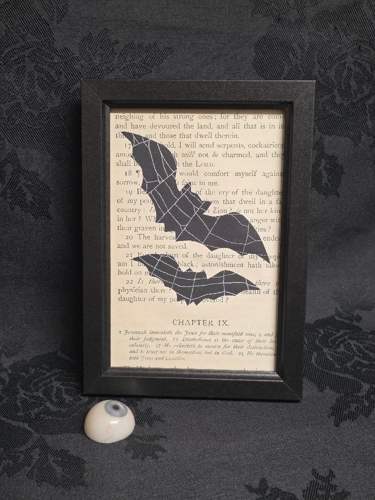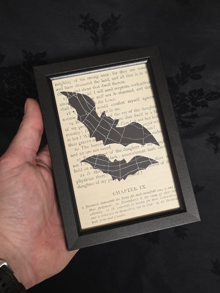 Something different, our 1800s Bible page backgrounds, but this time they are BAT SILHOUETTES!! with real preserved spider webs instead the bats! Each piece is different