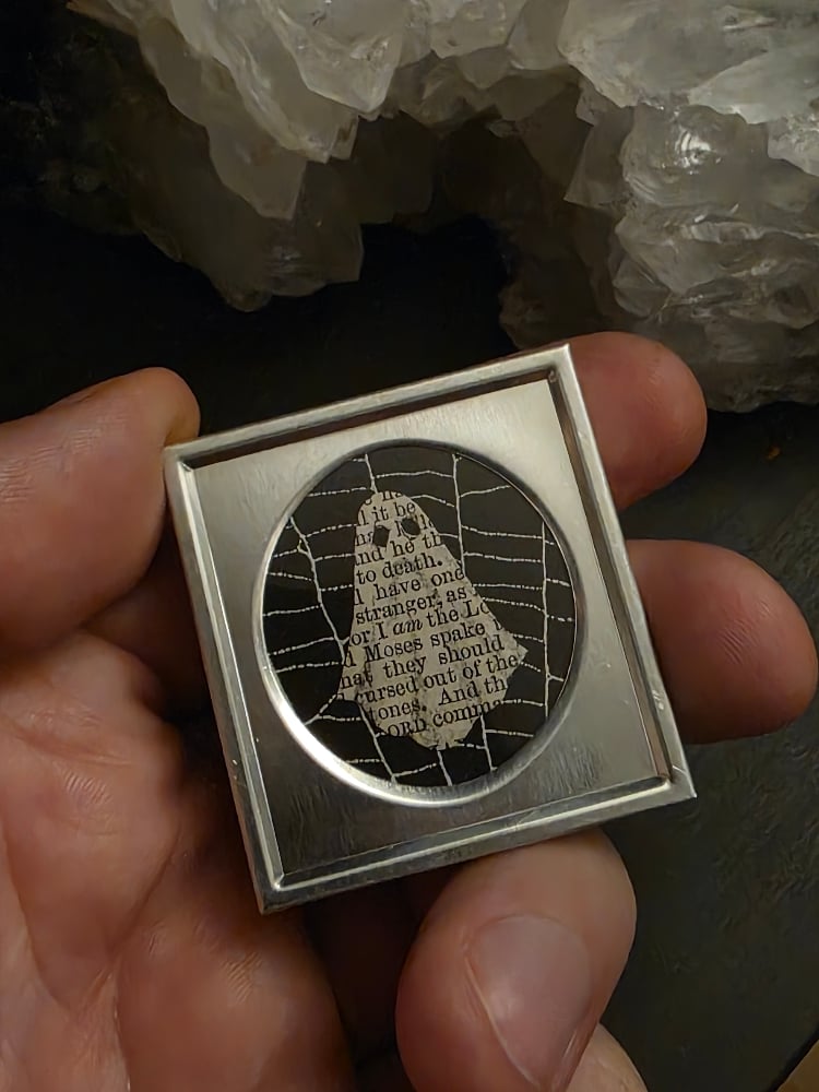Something different, our 1800s Bible pages transformed into ghosts! here we have a Bible page ghost collection with preserved spider webs. each piece is different with its own frame and unique web.