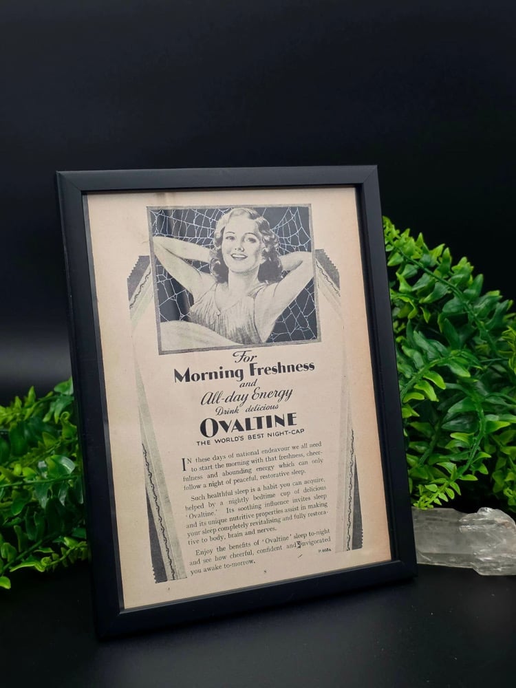 OVALTINE advert from 1940s with a real preserved web in a frame