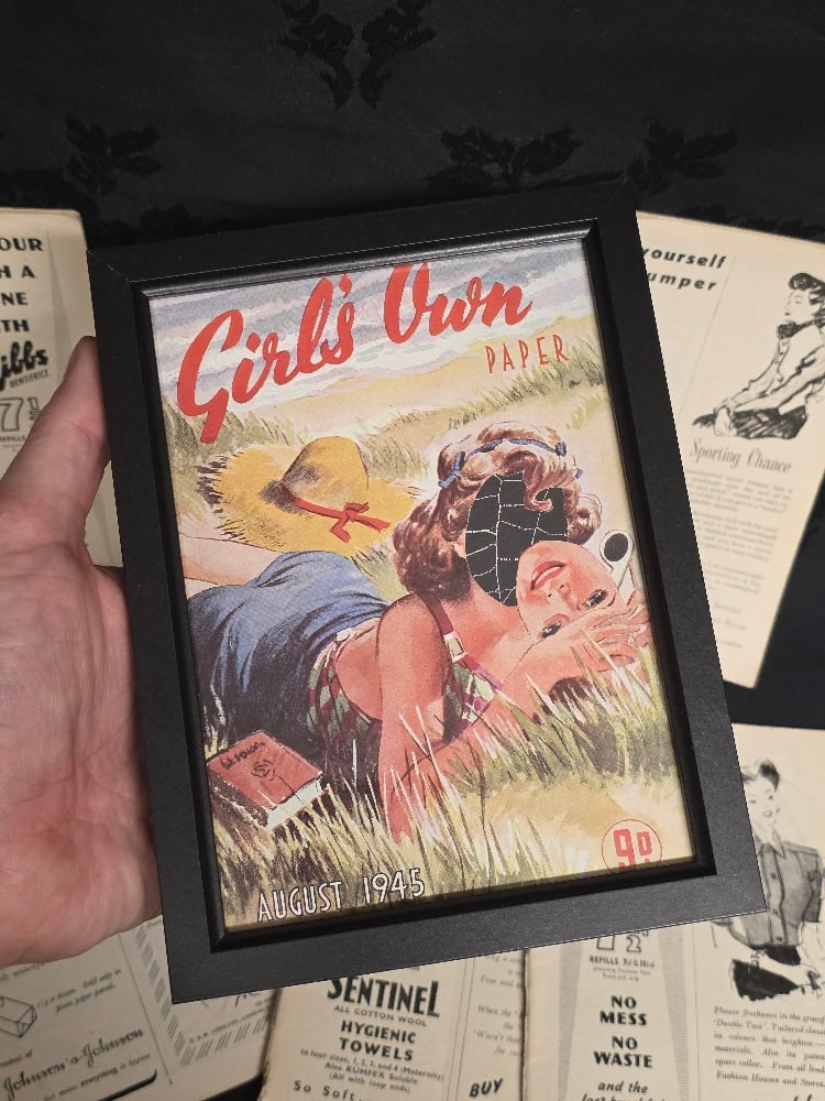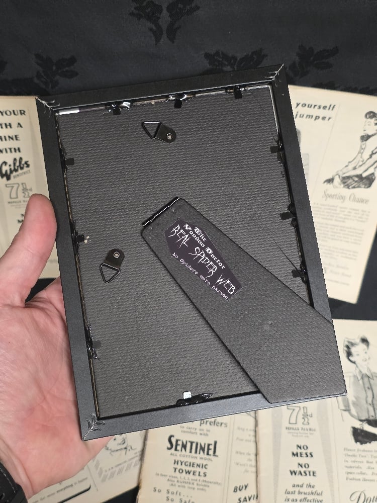 Something unique, beautiful and fun, vintage covers from a 1945 publication (the year WW2 ended), I have used a real preserved spider web behind the face, and the face is hidden somewhere in the piece. All framed in black frames.