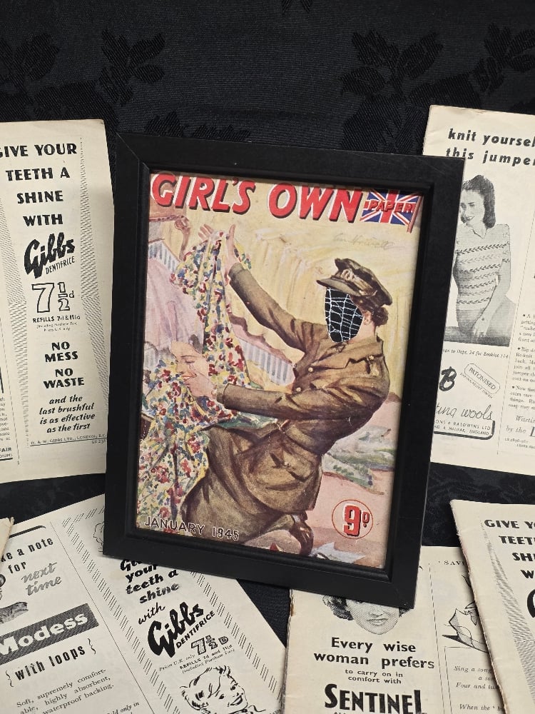 Something unique, beautiful and fun, vintage covers from a 1945 publication (the year WW2 ended), I have used a real preserved spider web behind the face, and the face is hidden somewhere in the piece. All framed in black frames.