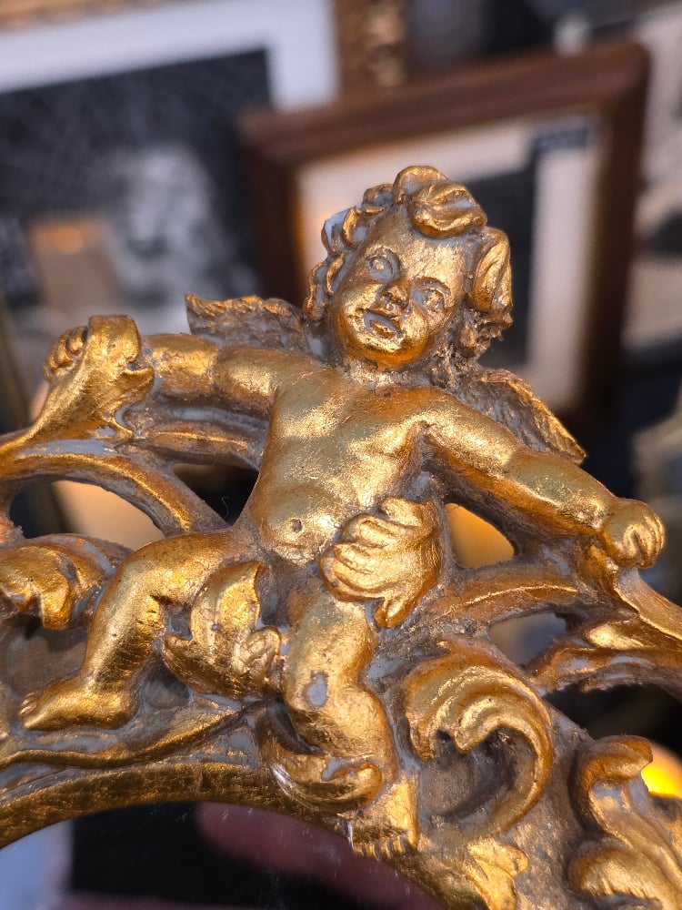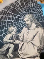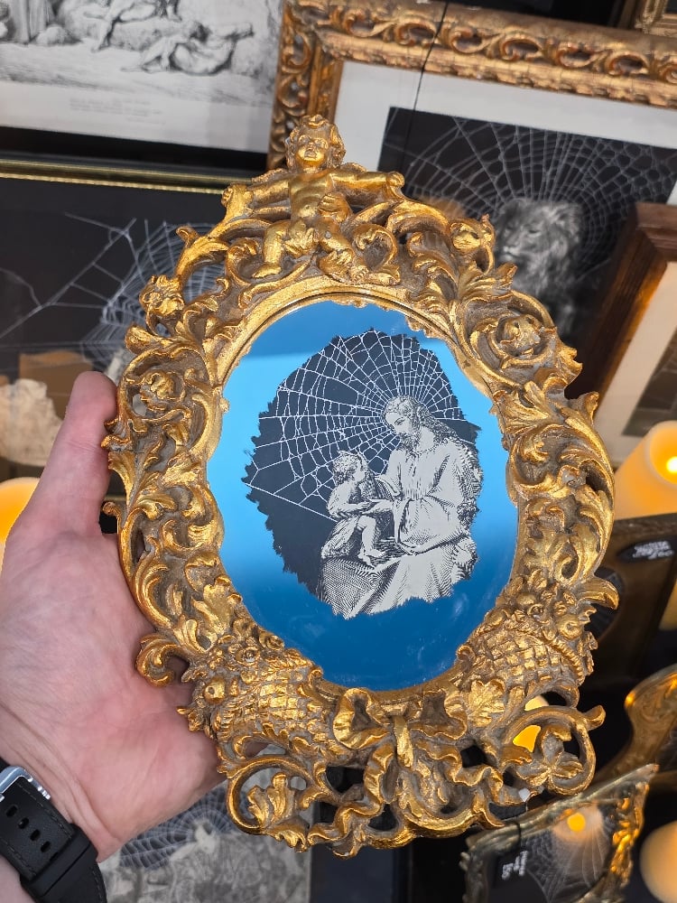 1800s Bible page “Jesus” with real preserved spider web, this piece is behind the beautiful cherub ornate mirror which means you can clean and use your mirror and the piece will be preserved and protected behind it.