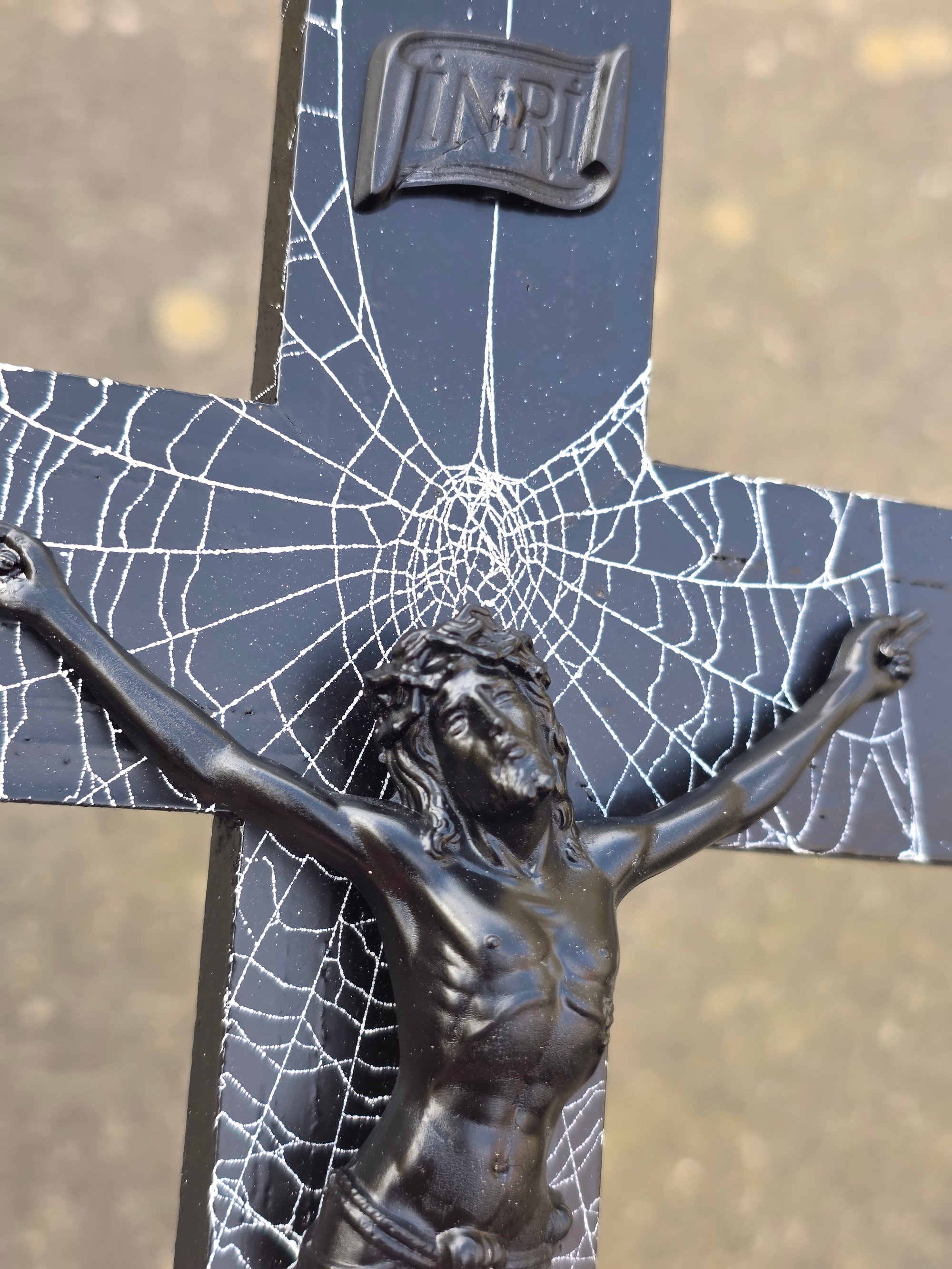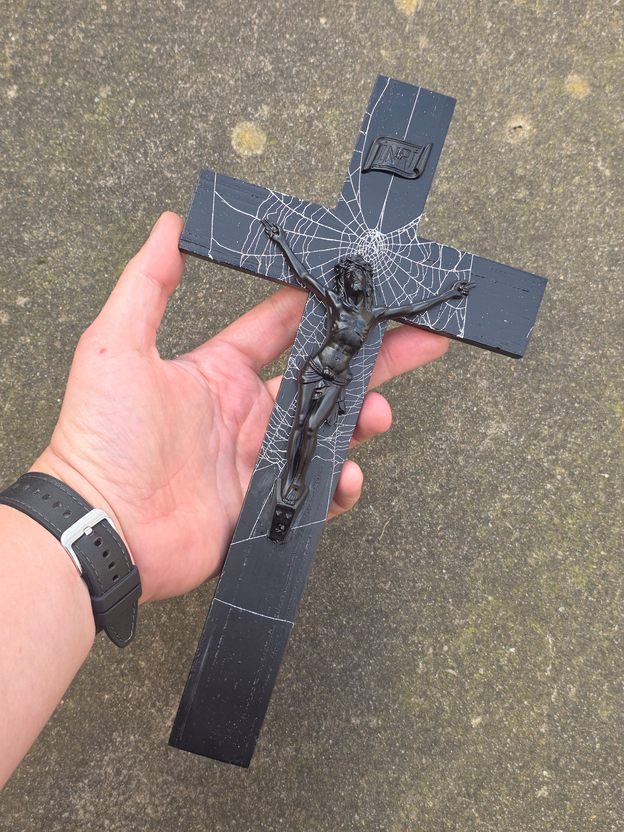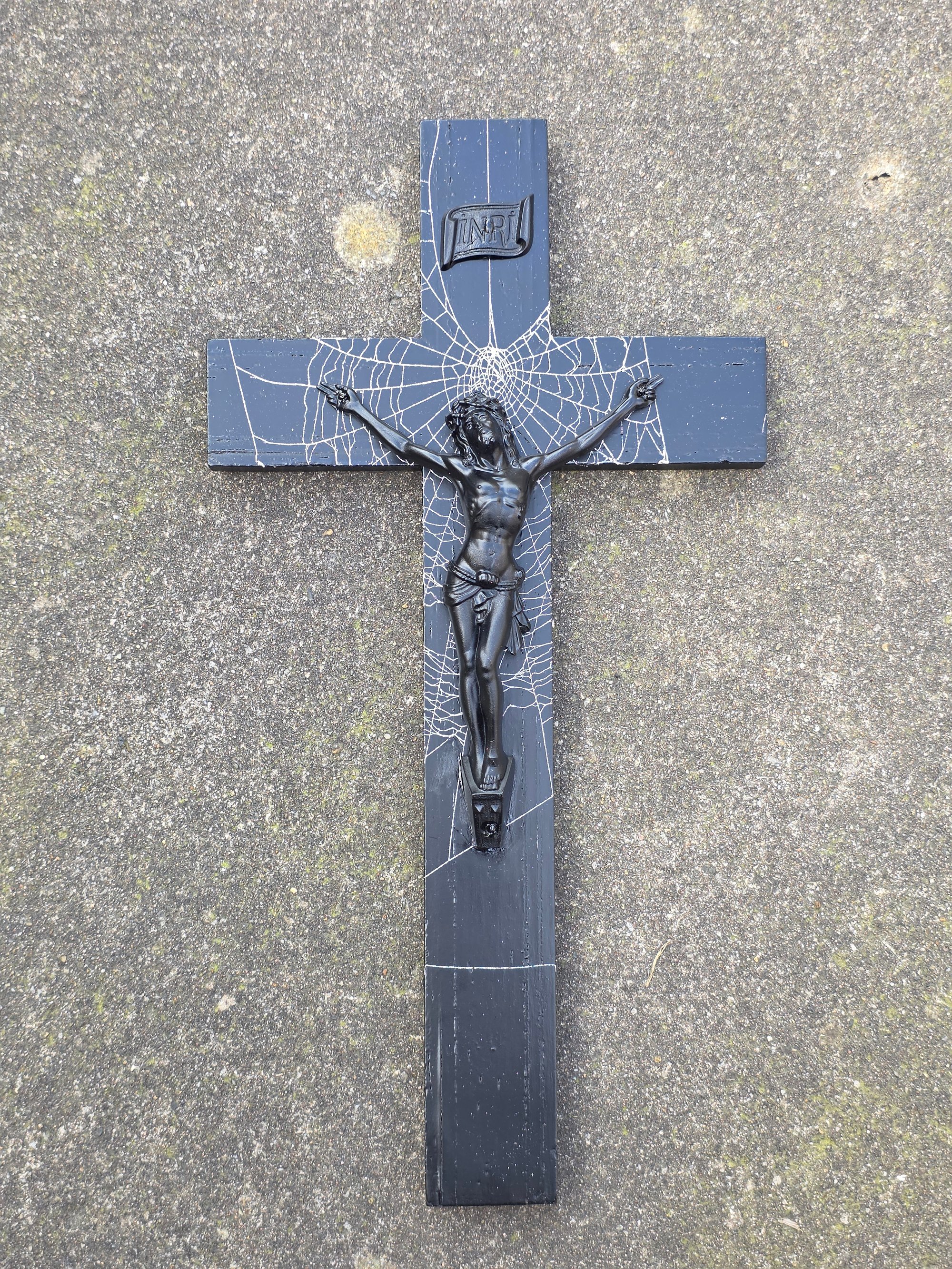 Genuine Vintage Crucifix purchased at an antique store, painted black with a real preserved spider web carefully placed on it.