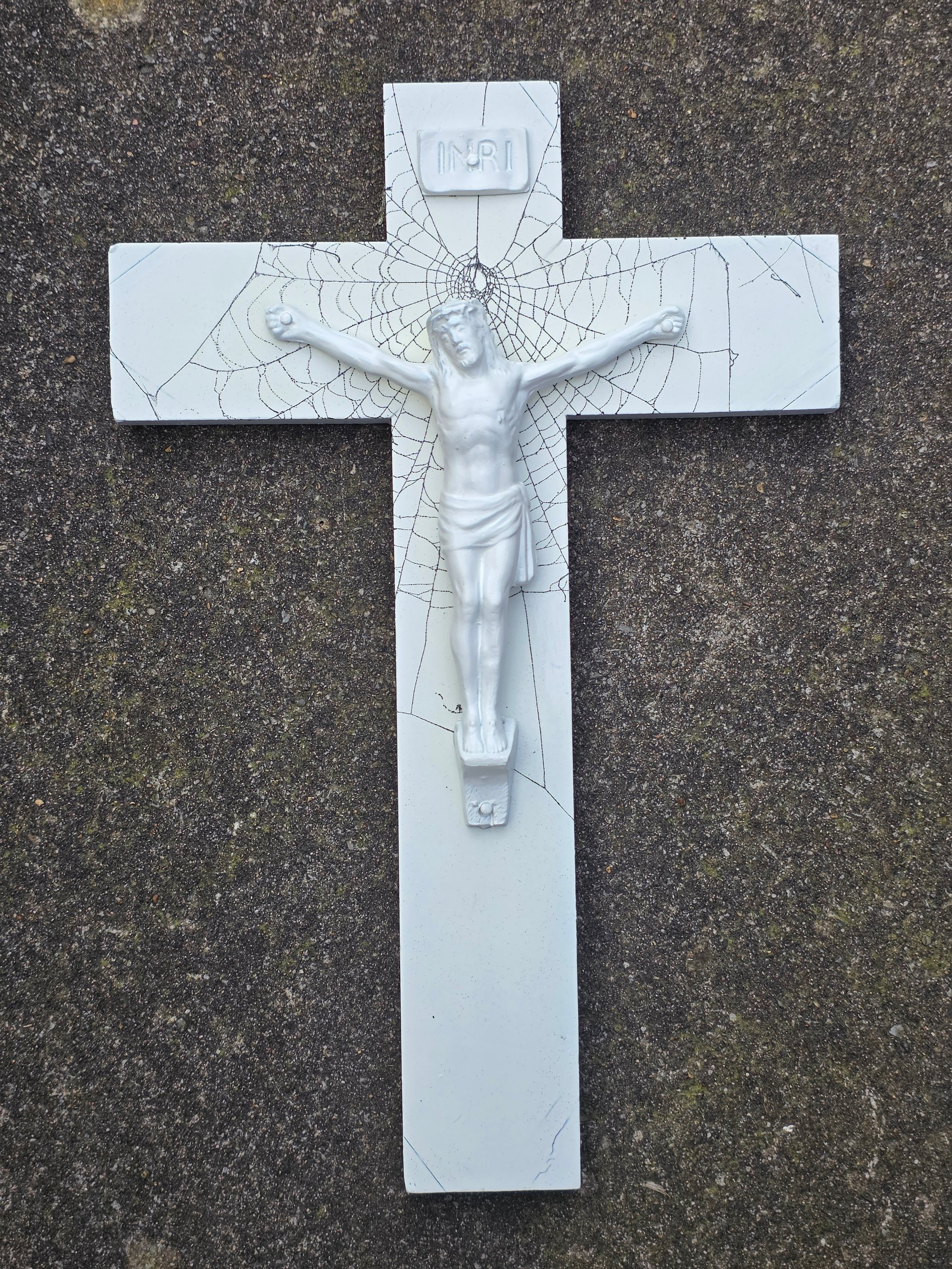 Genuine Vintage Crucifix purchased at an antique store, painted black with a real preserved spider web carefully placed on it.