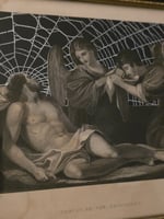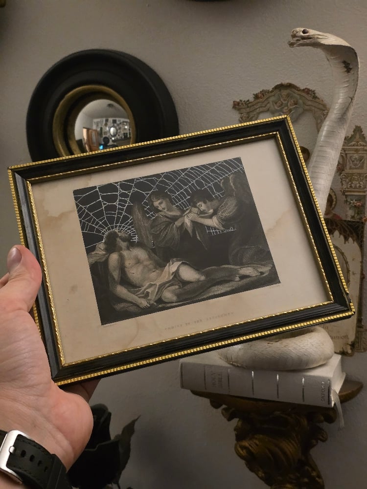 This piece is framed in a beautiful antique frame which matches the piece perfectly, the background is a 1800's bible page, and it includes a real preserved spider web placed carefully behind