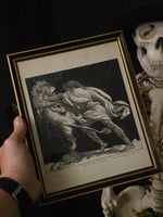 This piece is framed in a beautiful antique frame which matches the piece perfectly, the background is a 1800's bible page, and it includes a real preserved spider web placed carefully behind
