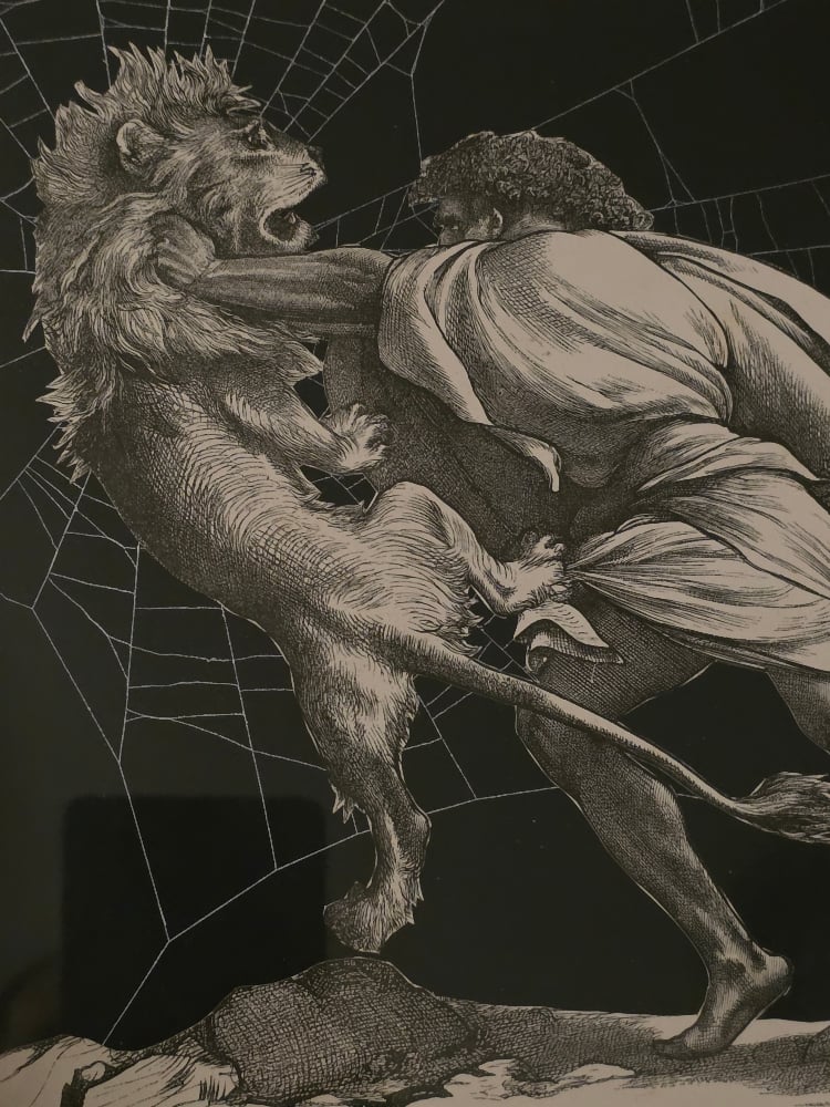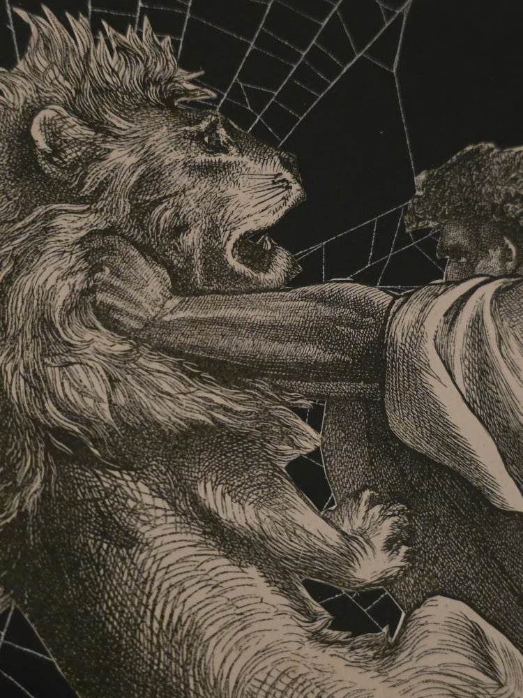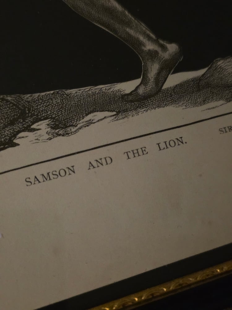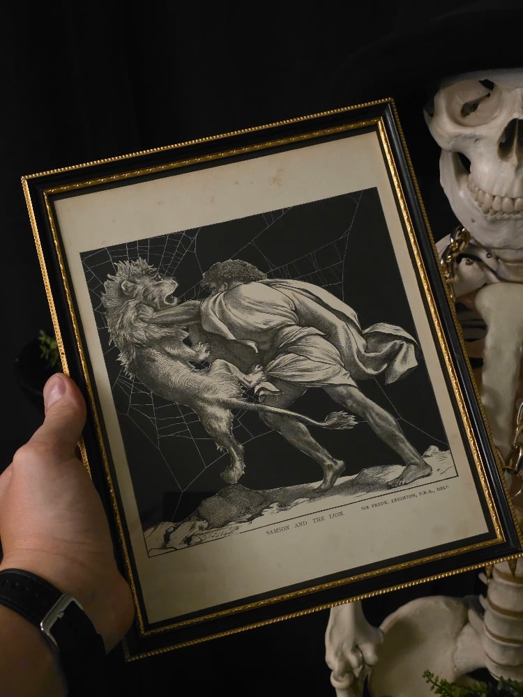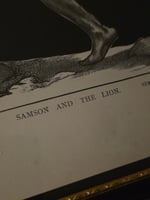 "SAMSON and the lion" 1800's bible page with preserved spider web