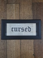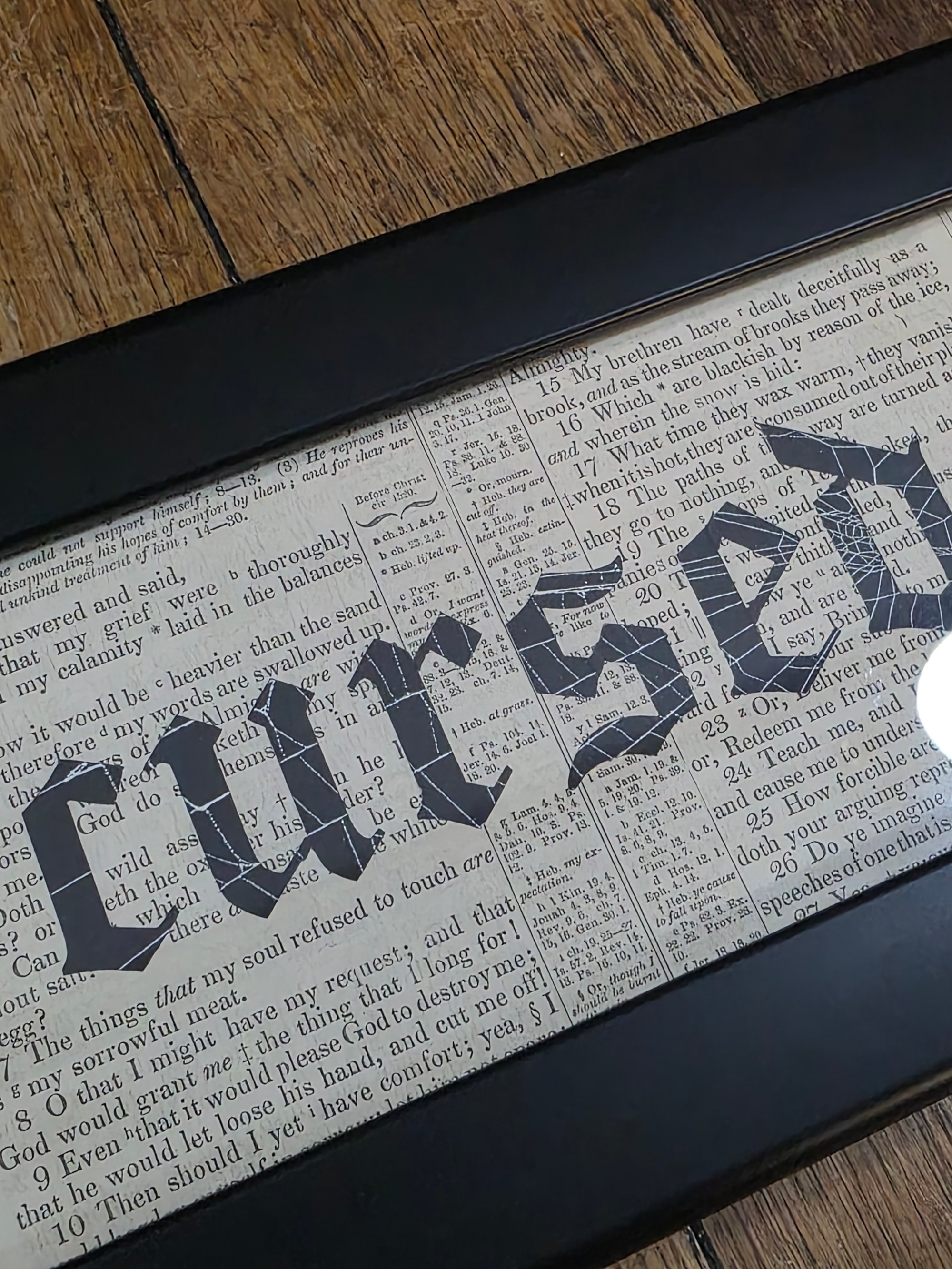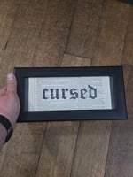 This piece is framed in a beautiful black frame which matches the piece perfectly, the background is an 1800's bible page, and it includes a real preserved spider web behind the Cursed Lettering.