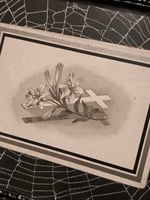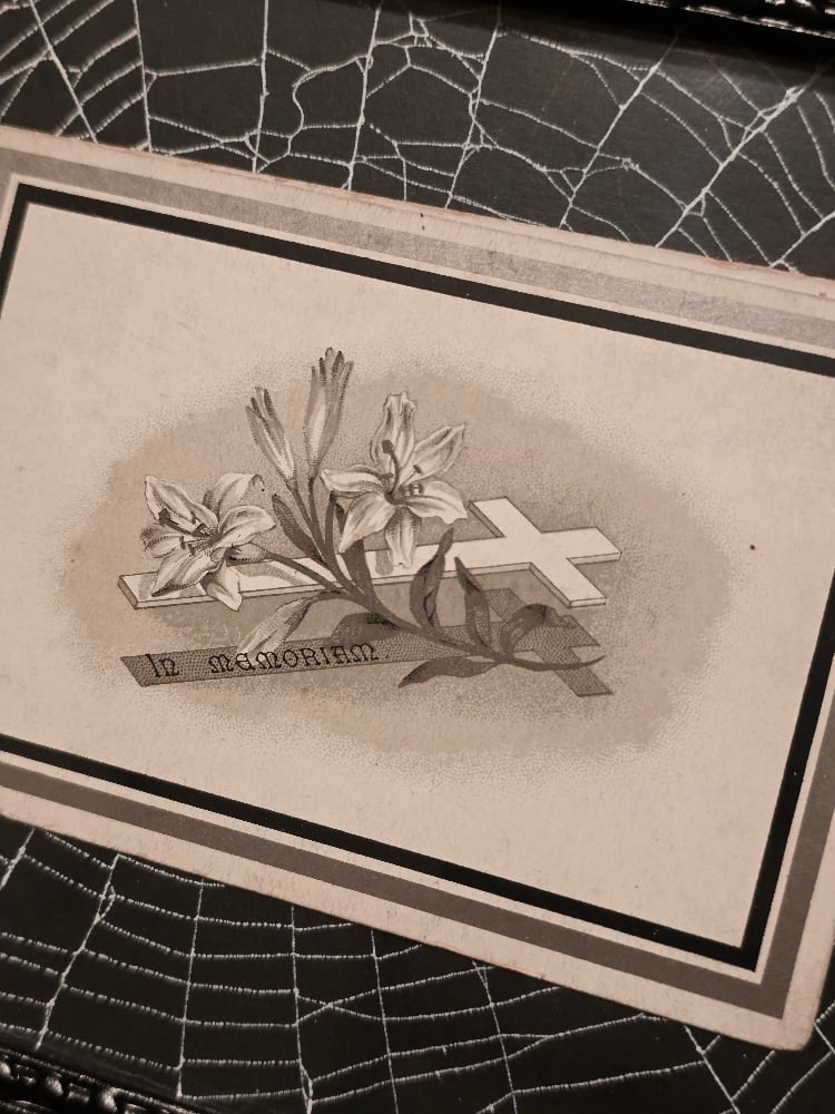 A haunting, yet beautiful collection, the Memorial cards from the 1800s paired with real preserved spider web.