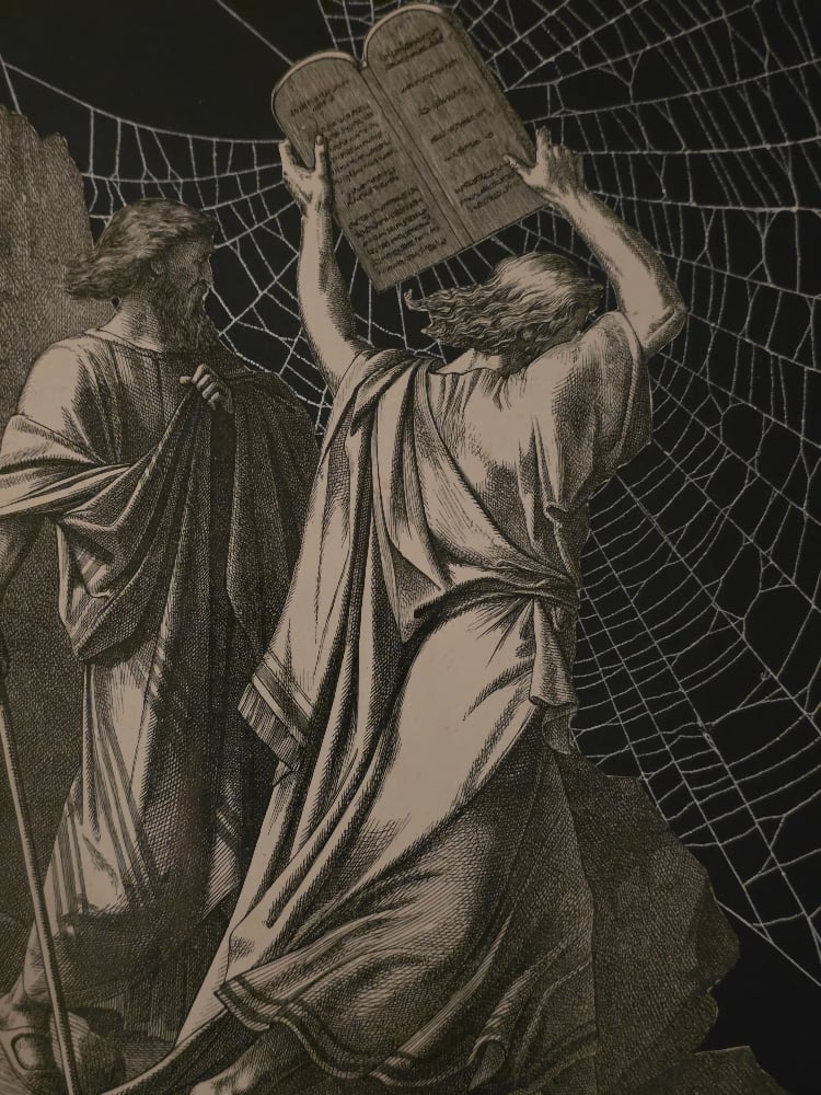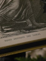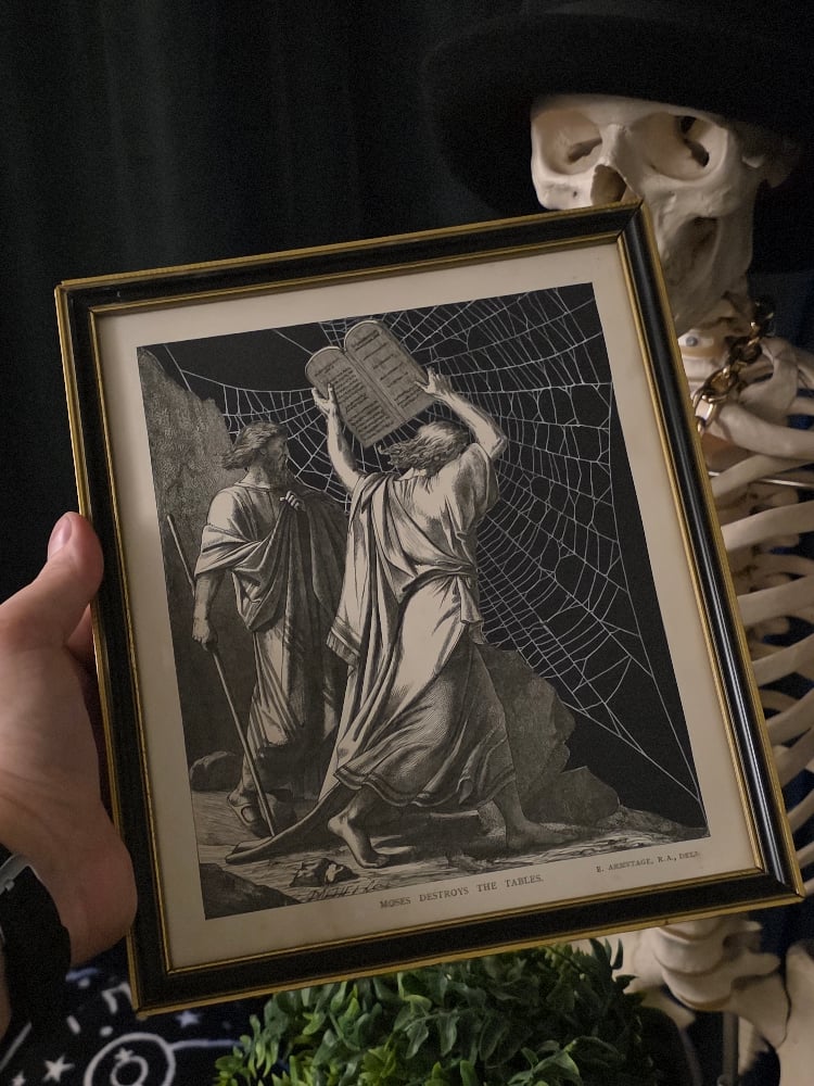 "Moses breaking the tables" 1800's bible page with preserved spider web