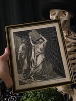 This piece is framed in a beautiful antique frame which matches the piece perfectly, the background is a 1800's bible page, and it includes a real preserved spider web placed carefully behind