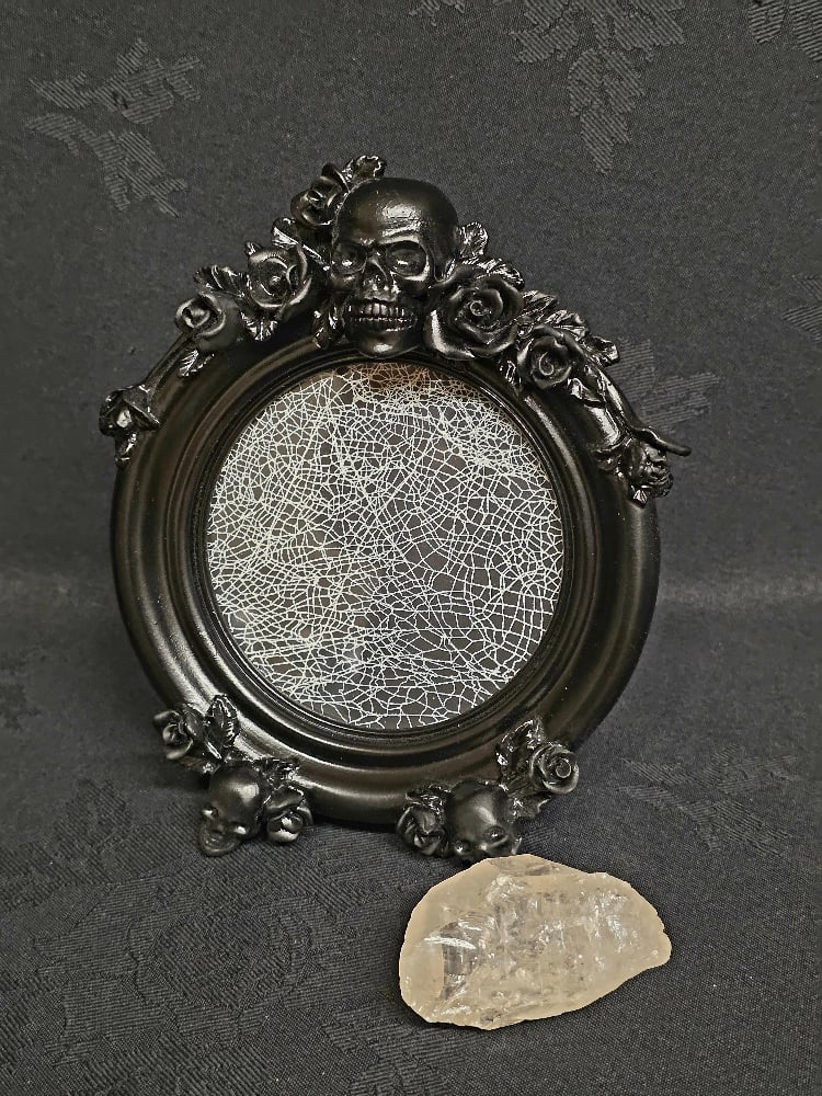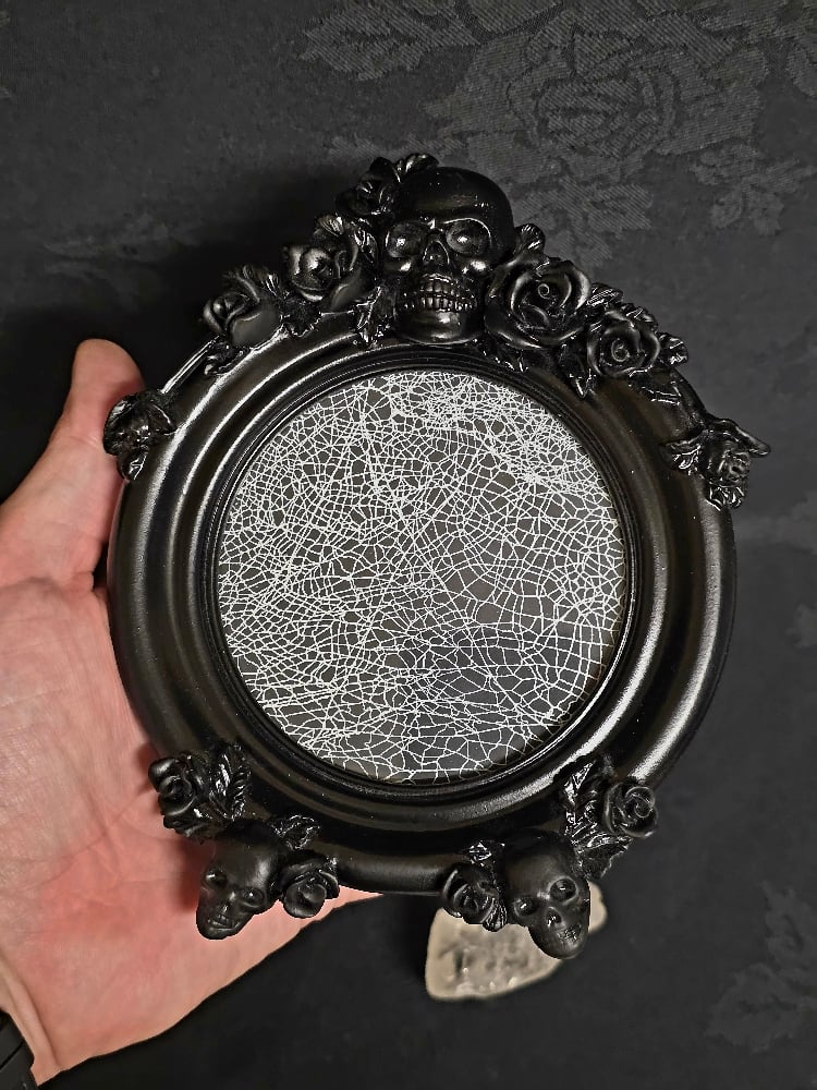 A ornate skull frame with a Noble false widow preserved web inside. Very unique. I think this web creates a really interesting talking point.