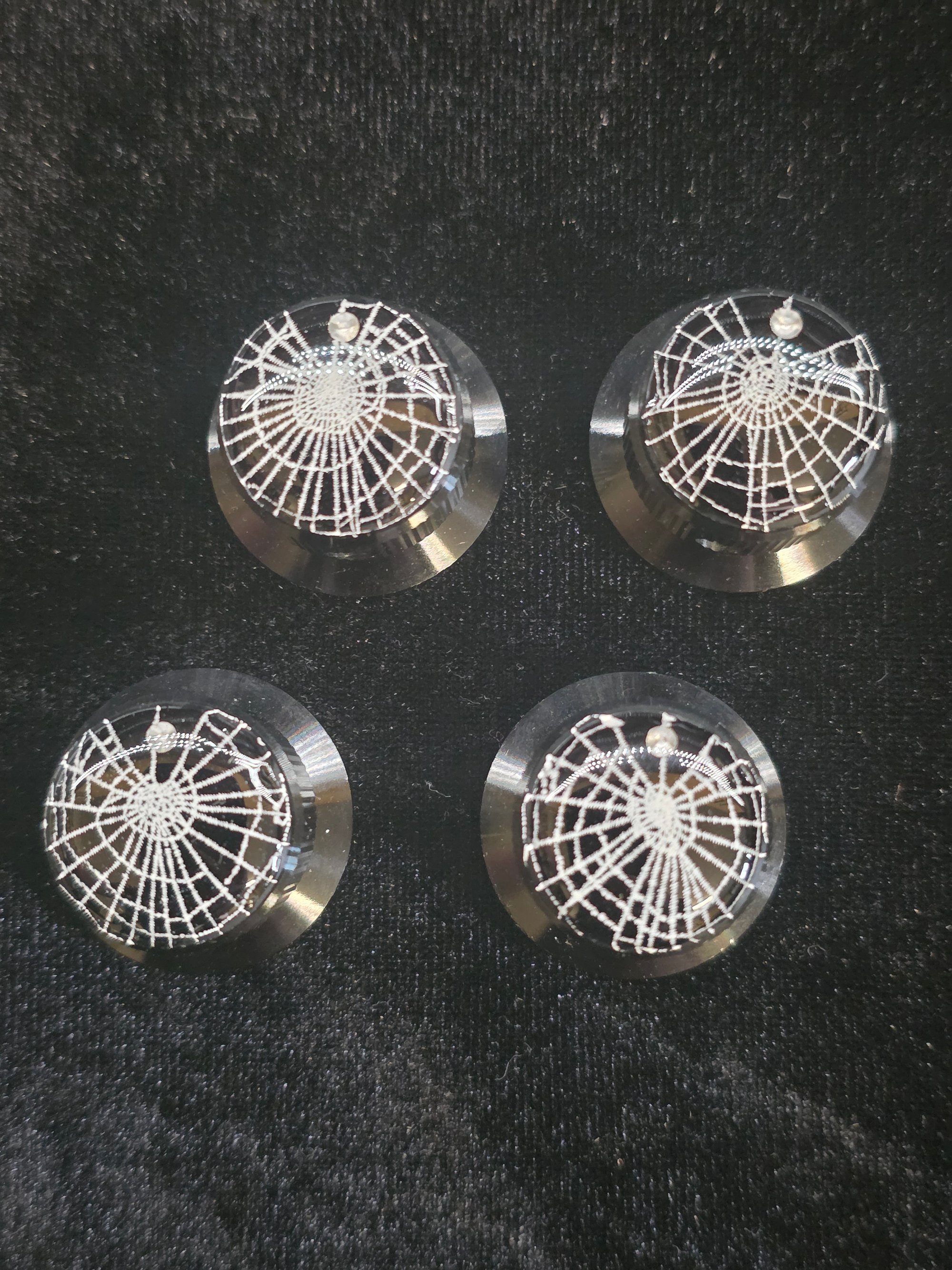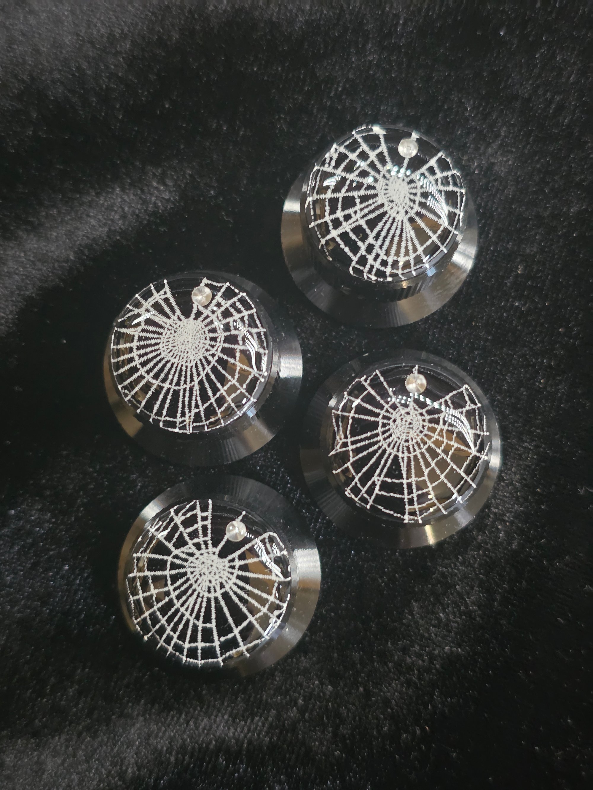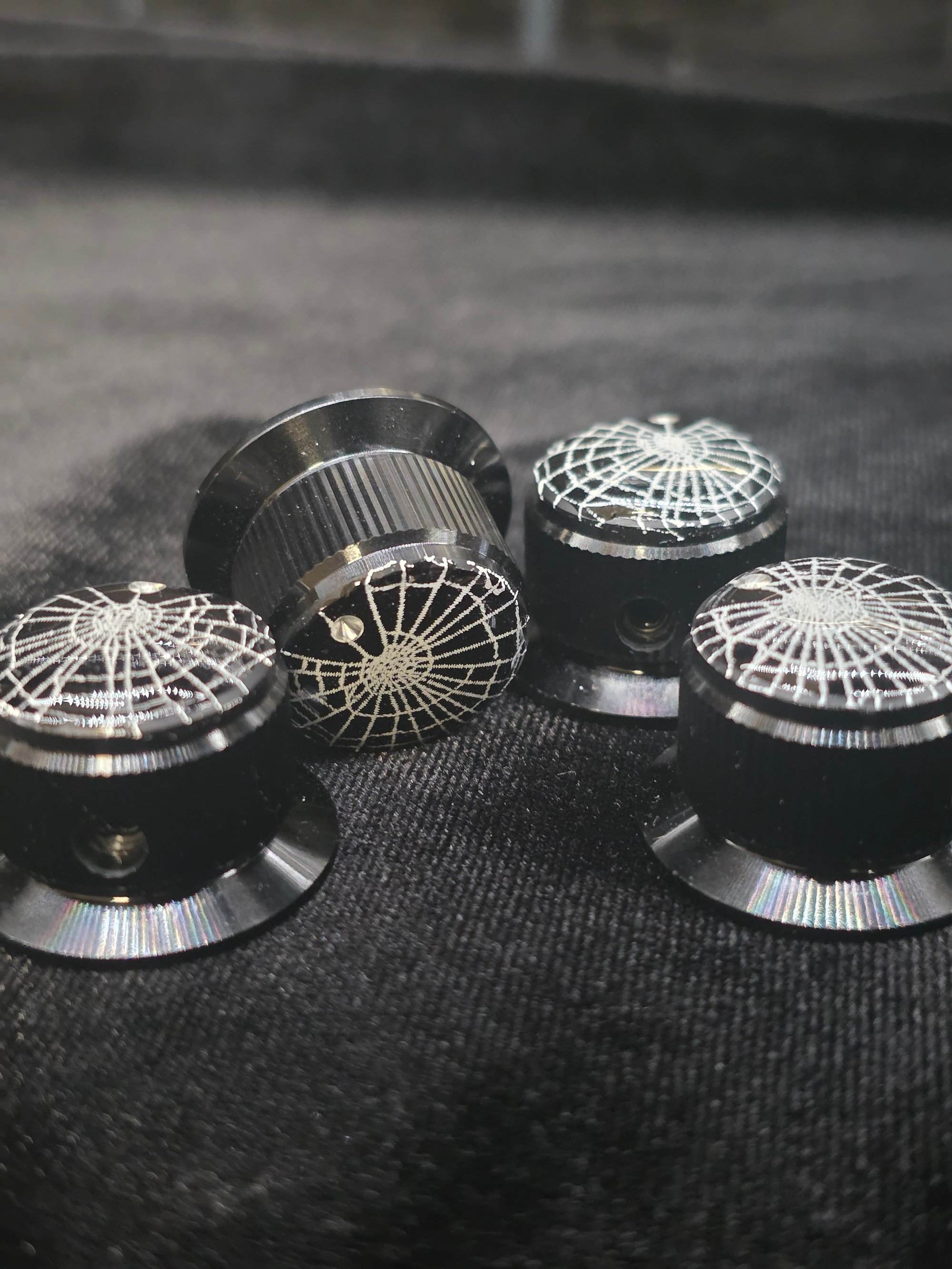 Black Aluminium guitar potentiometer knobs with real preserved spider webs.