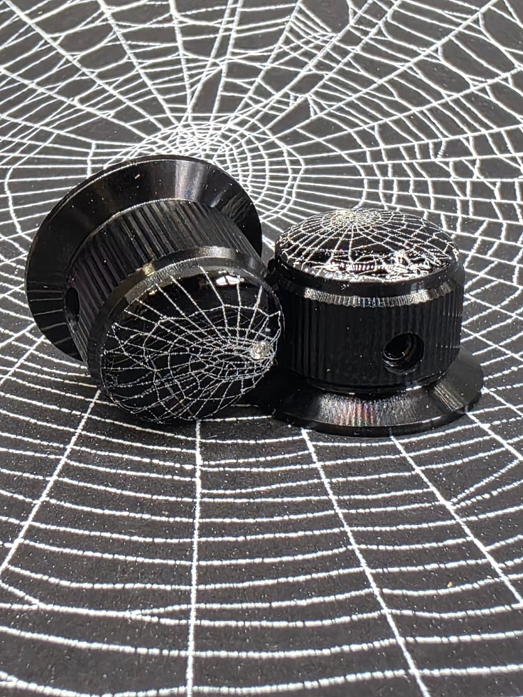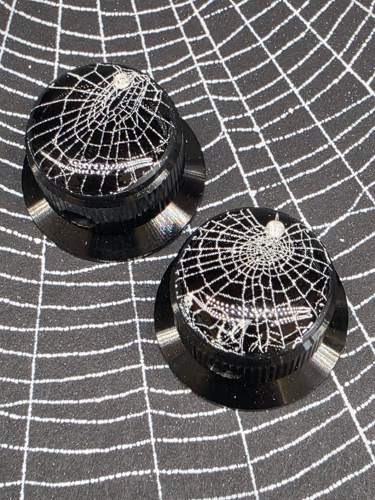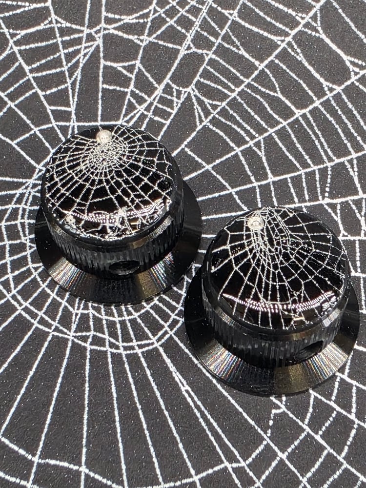 Black Aluminium guitar potentiometer knobs with real preserved spider webs.