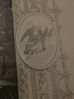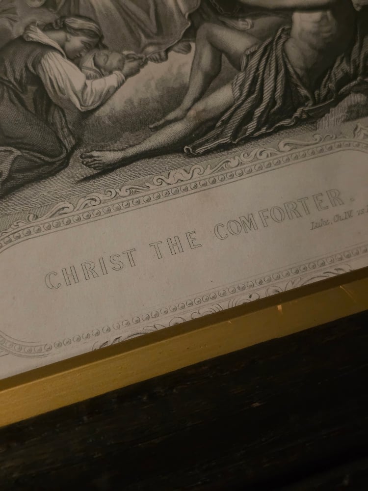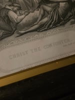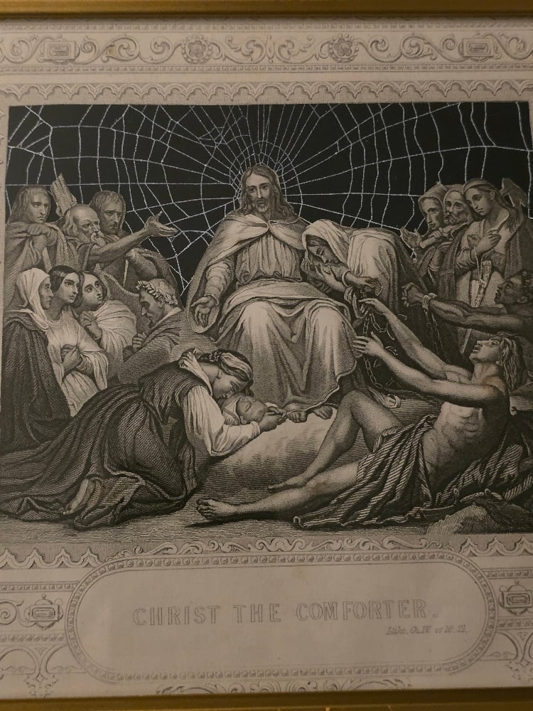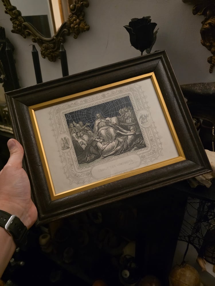 This piece is framed in a beautiful wooden frame which matches the piece perfectly, the background is a 1800's bible page, and it includes a real preserved spider web placed carefully behind