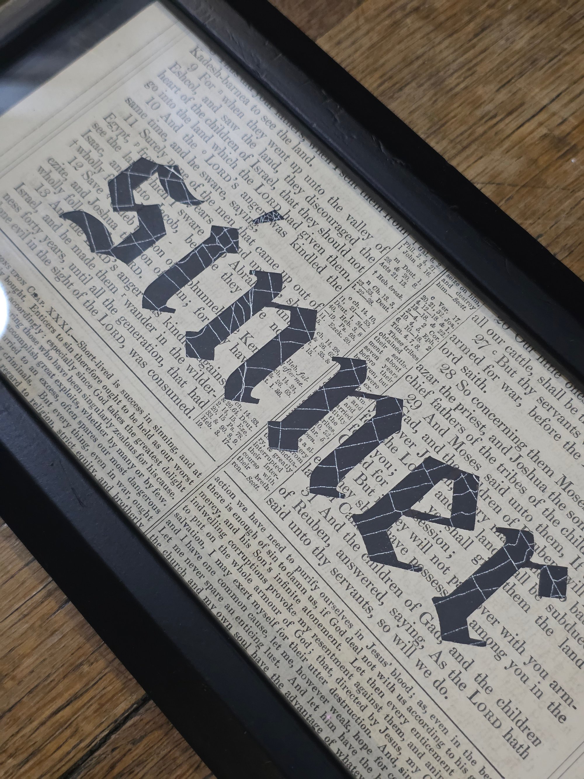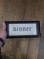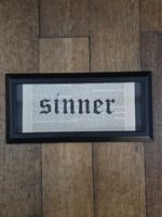 This piece is framed in a beautiful black frame which matches the piece perfectly, the background is an 1800's bible page, and it includes a real preserved spider web behind the Sinner Lettering.