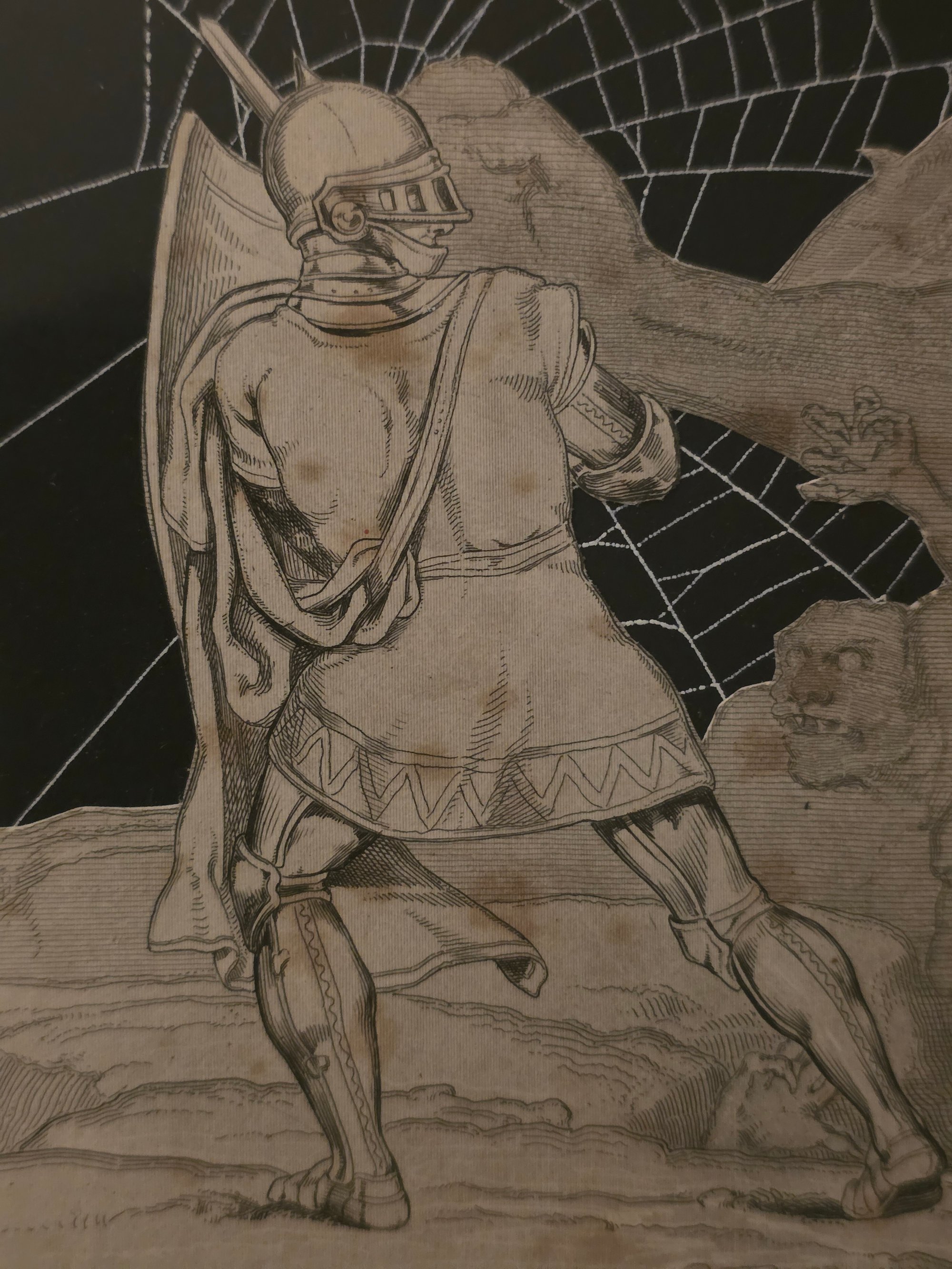 STATEMENT - Pilgrams Progress page 1800s with preserved spider web, using antique frame.