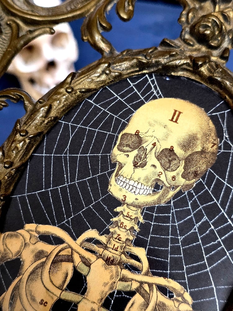This is the largest piece in the collection, its inside an old heavy brass frame which really works with the anatomical skeleton engraving, this is a haunting yet classy piece. A complete one off unique piece that you wonโt find again.