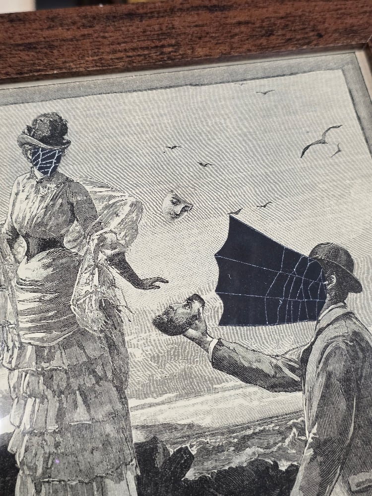 Page from antique publication "girls own paper" dated 1800s - with spider web faces.